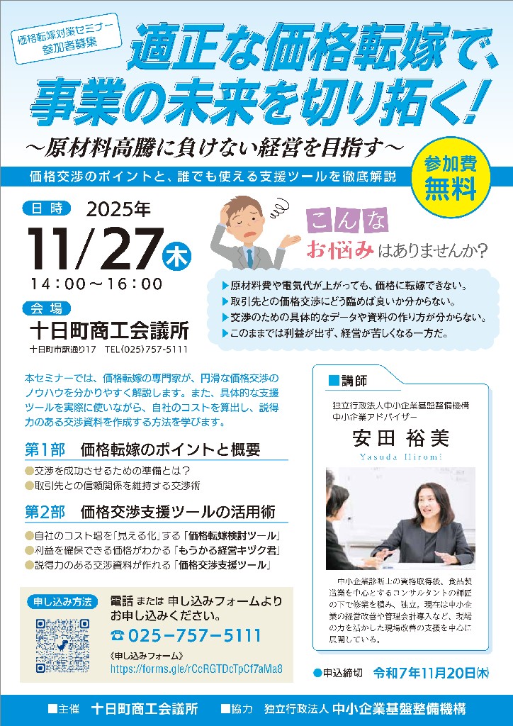 原材料高騰に負けない経営を目指す!「価格転嫁対策セミナー」参加者募集